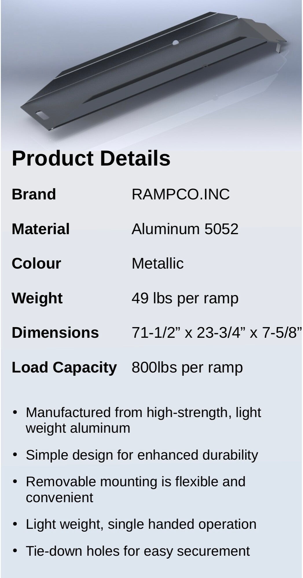 Check out this 6 ft aluminum utility ramp light yet rated for 800lbs . It's convenient and easy to use with hooks that hook into tie down the tie down rail of a trailer, also has convenient strap holes to strap ramp down for easy and safe loading. Use it on your trailer or landing pad . We build them in three different sizes a 4ft ,5ft, and 6ft length . To order yours contact us by email peter@precisiontinyhomes.com or call 4035108686 for more information . thanks shipping from Alberta and Ontario ask for details and cost.
