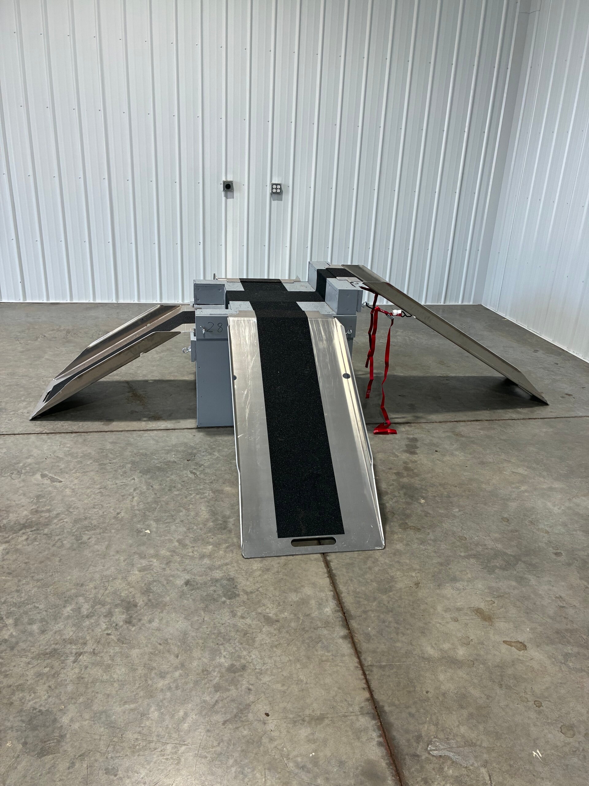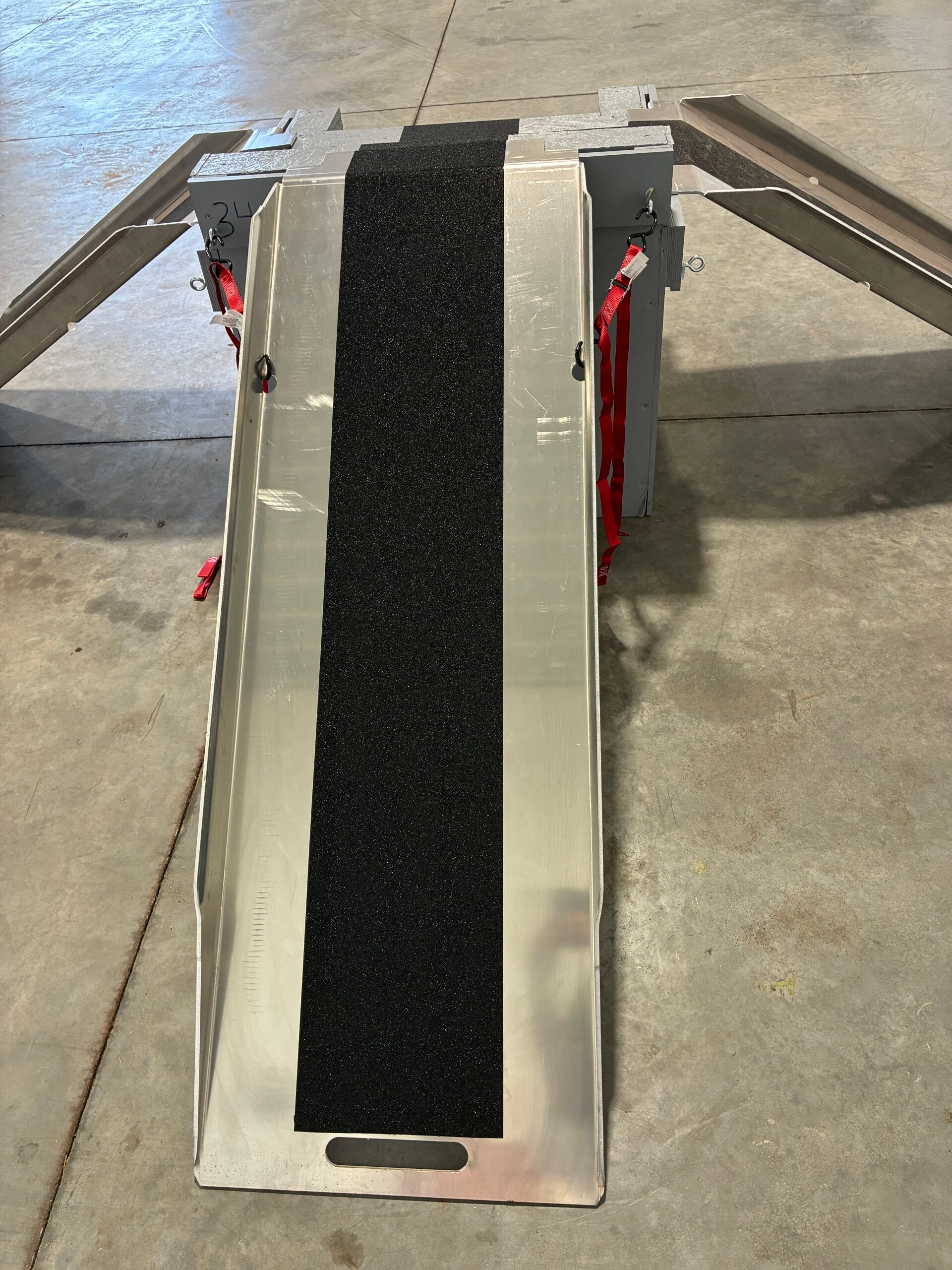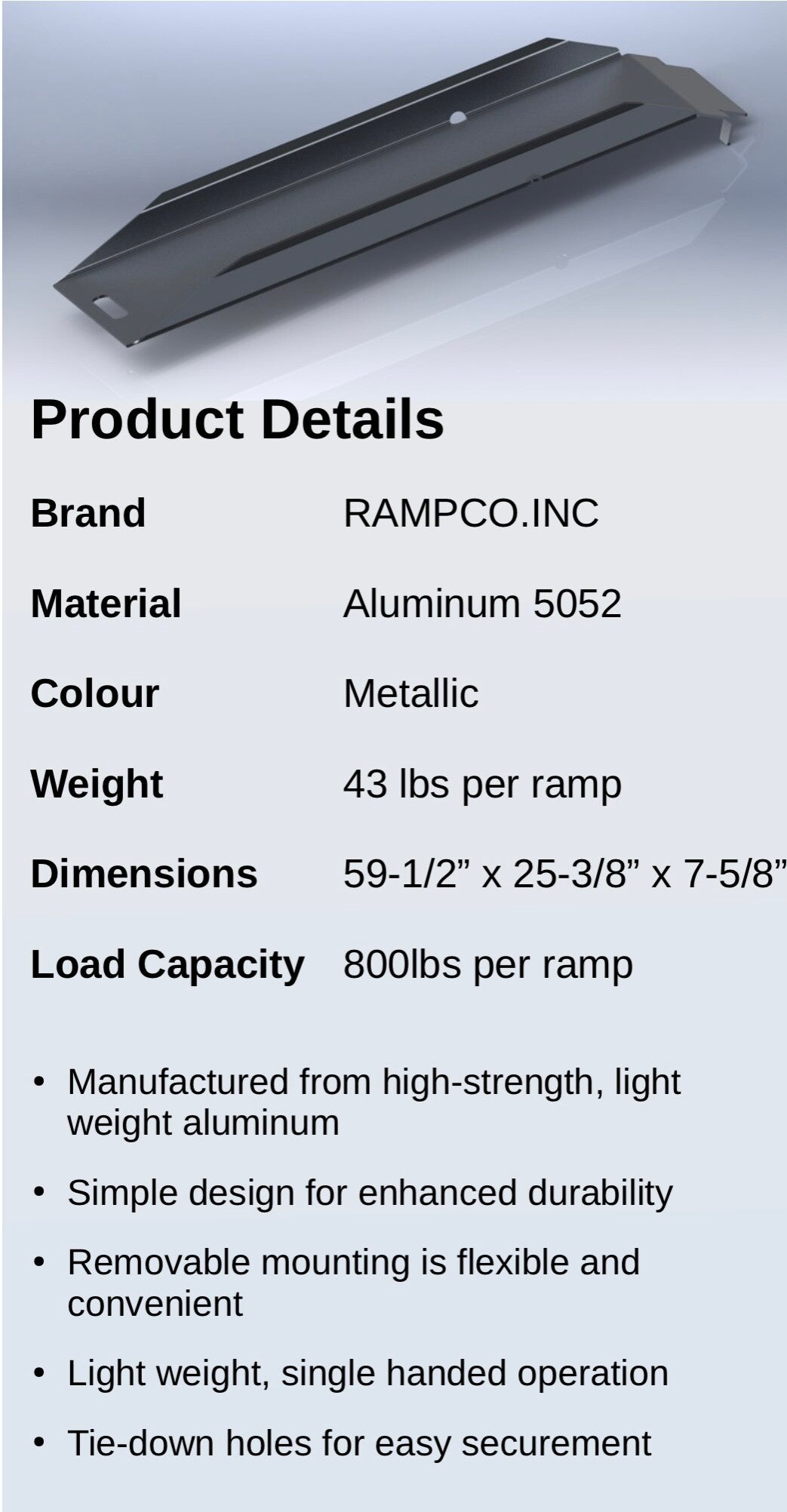 Check out this 5 ft aluminum utility ramp light yet rated for 800lbs . It's convenient and easy to use with hooks that hook into tie down the tie down rail of a trailer, also has convenient strap holes to strap ramp down for easy and safe loading. Use it on your trailer or landing pad . We build them in three different sizes a 4ft ,5ft, and 6ft length contact us for more information.thanks